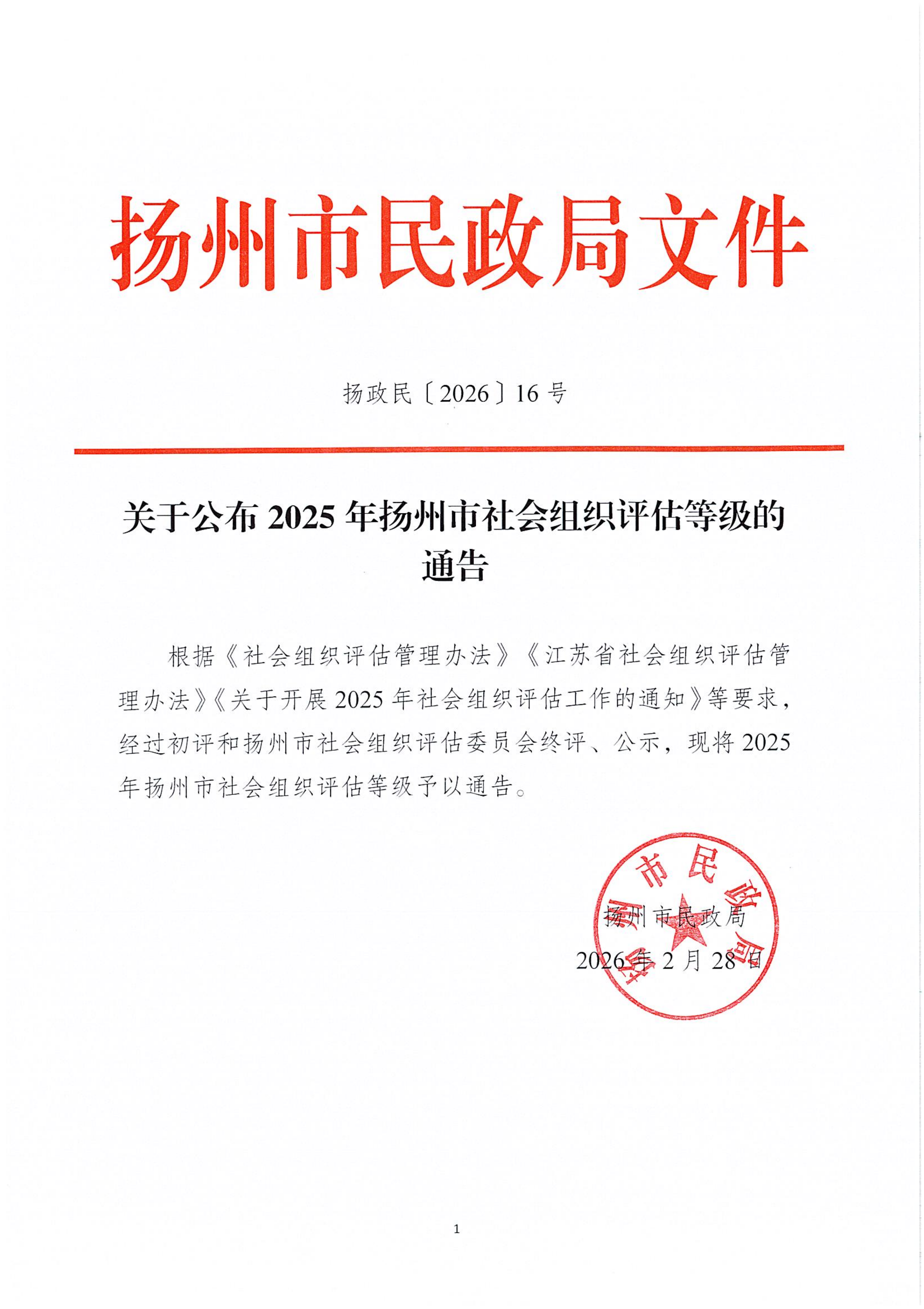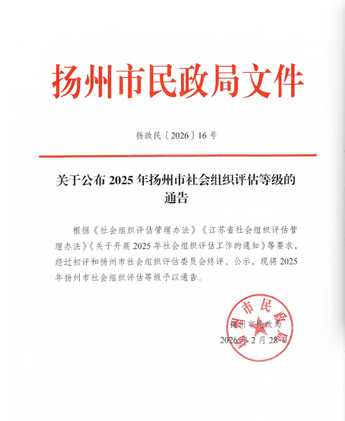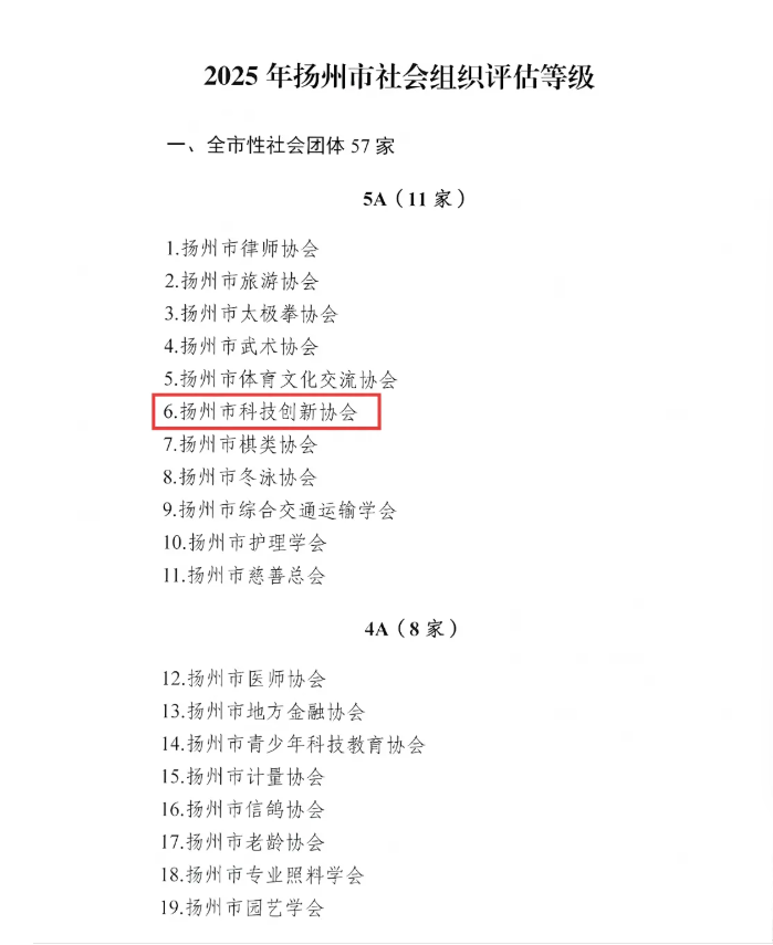 热烈祝贺扬州市科技创新协会在2025年扬州市社会组织评估中荣膺5A等级!这是对协会成立以来坚持党建引领、科创驱动、深耕服务、勇担使命的充分肯定,也是全体会员凝心聚力、锐意创新、共谋发展的智慧结晶。以此为新的起点,愿我们携手共进,在赋能产业升级、服务科技工作者的道路上再谱新篇,为扬州高质量发展贡献更多科创力量!